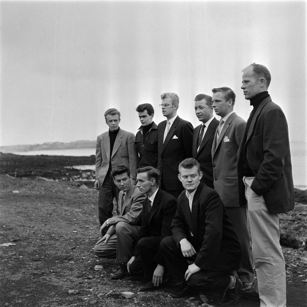 Íslensku varðskipsmennirnir sem voru fangar breta í landhelgismálinu, eftir að þeir höfðu farið í handtökuferð um borð í breskan landhelgisbrjót. Þeir voru fluttir sem fangar yfir í herskipið Eastbourn þar sem þeim var haldið í 10 daga. "Luxuslíf. Tveir bjórar á dag", sagði Óli Valur Sigurðsson, skipherra, sem þá var háseti og einn hinna handteknu. Fangarnir voru settir í árabát að næturlagi rétt undan við Keflavík og þurftu að róa í land. Eastbourn þurfti að komast til Bretlands. Þessi mynd er tekin af föngunum í Selsvörinni í Reykjavík eftir ævintýrið.