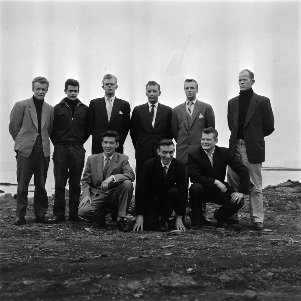 Íslensku varðskipsmennirnir sem voru fangar breta í landhelgismálinu, eftir að þeir höfðu farið í handtökuferð um borð í breskan landhelgisbrjót. Þeir voru fluttir sem fangar yfir í herskipið Eastbourn þar sem þeim var haldið í 10 daga. "Luxuslíf. Tveir bjórar á dag", sagði Óli Valur Sigurðsson, skipherra, sem þá var háseti og einn hinna handteknu. Fangarnir voru settir í árabát að næturlagi rétt undan við Keflavík og þurftu að róa í land. Eastbourn þurfti að komast til Bretlands. Þessi mynd er tekin af föngunum í Selsvörinni í Reykjavík eftir ævintýrið.