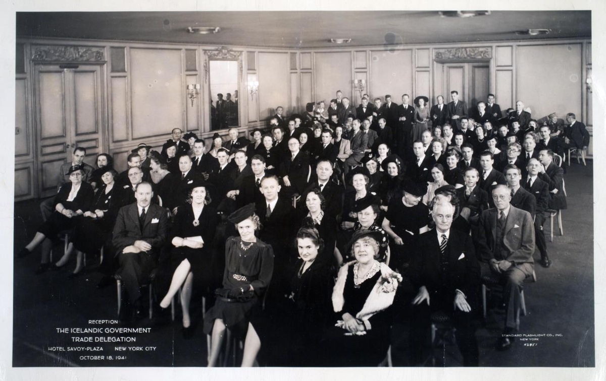 Hópur fólks í fundarsal. Á myndinni er texi: RECEPTION THE ICELANDIC GOVERNMENT TRADE DELEGATION HOTEL SAVOY-PLAZA NEW YORK CITY OCTIBER 18. 1941. Í hónum má þekkja Agnar Klemens Jónsson og Vilhjál Þór sem ber í hann. Vilhjálm Stefánsson sem ber í spegil, Helga Þorsteinsson sem er aftanlega til vinstri, Björn Ólafsson ráðherra sem sendur aftast og Vilberg Júlíusson með gleraugu aftarlega til hægri.