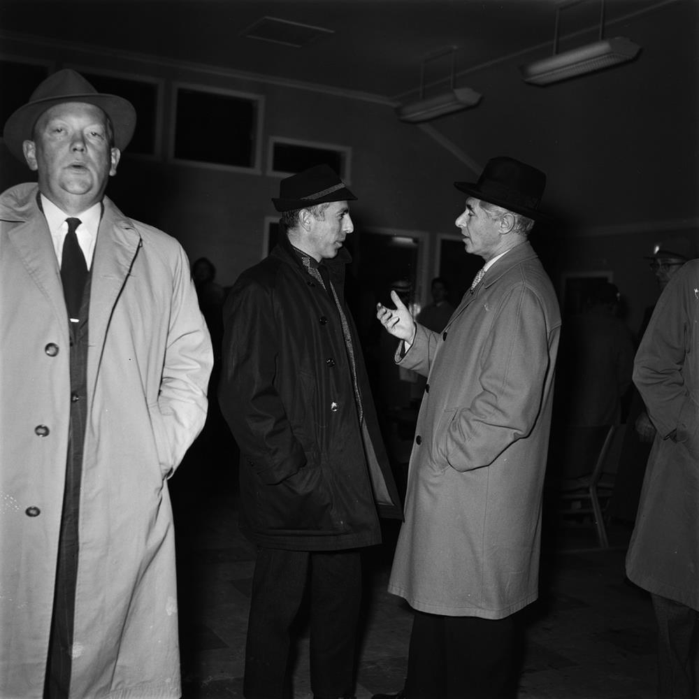 Þessar myndir eru teknar þegar Jerome Robbins kom með The Ballet of USA til Íslands. Hann var þá mjög þekktur bandarískur balletmeistari og flokkurinn hans "heimsfrægur". Heimsóknin þótti mjög merkilegur menningarviðburður sem hafði mikil áhrif á okkar menningarflóru. Á einni myndinni má sjá Guðlaug Rósinkranz þjóðleikhússtjóra tala við Robbins til vinstri er Hörður Bjarnason, sem var í leikhúsráði og húsameistari ríkisins. Myndirnar eru að öllum líkindum teknar á Reykjavíkurflugvelli,.