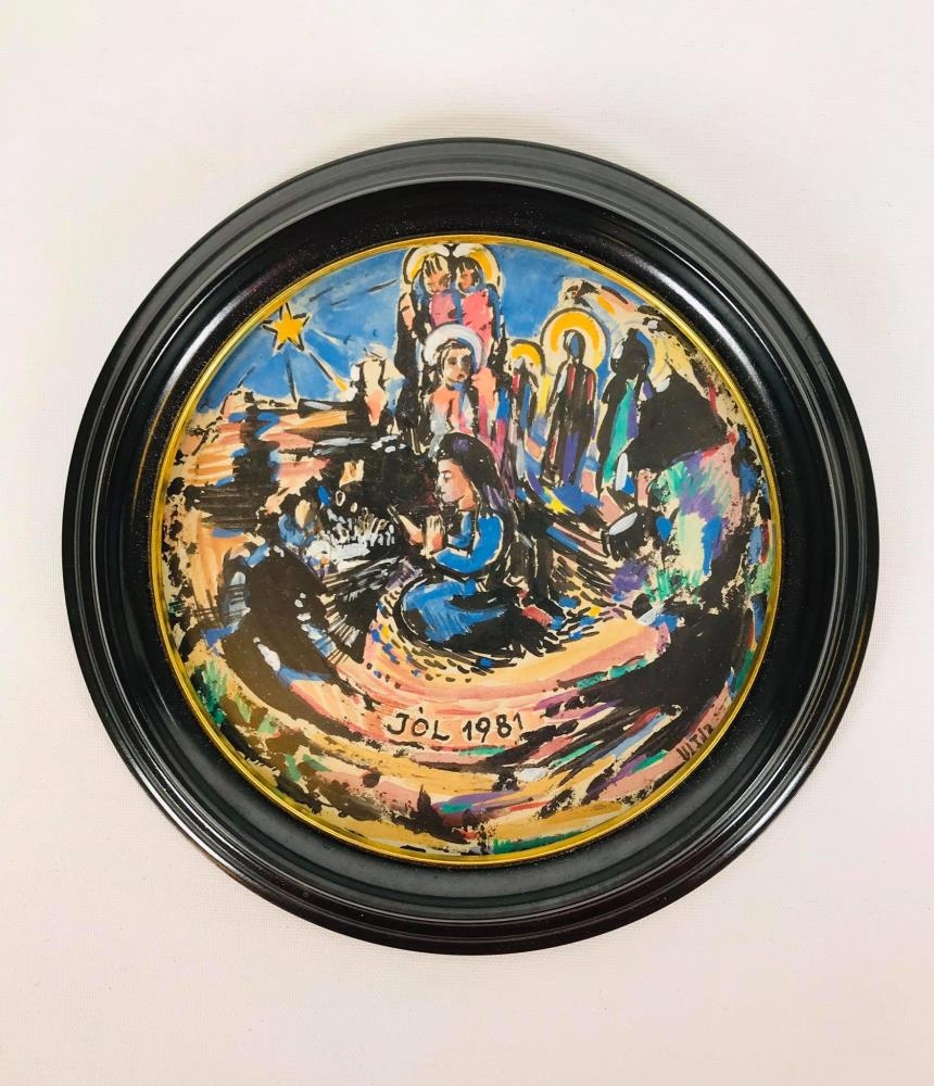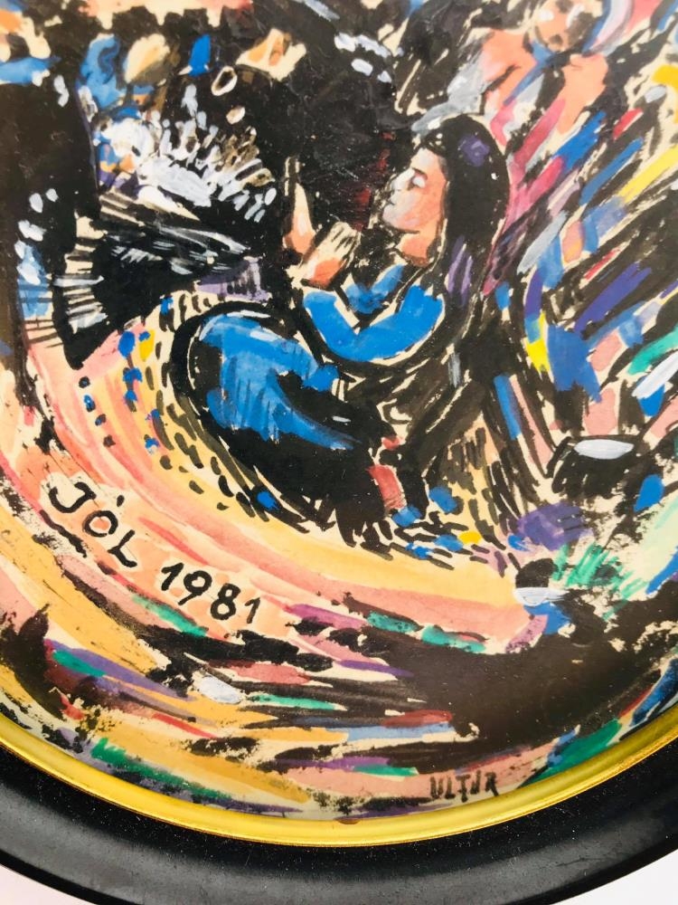 Skrautplatti, jólaskraut. Lítið hringlaga málverk í svörtum plastramma, áletrun : Jól 1981, Úlfur. Sýnir konu á bæn, bláleit föt og litríkt umhverfi.