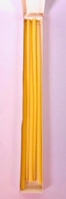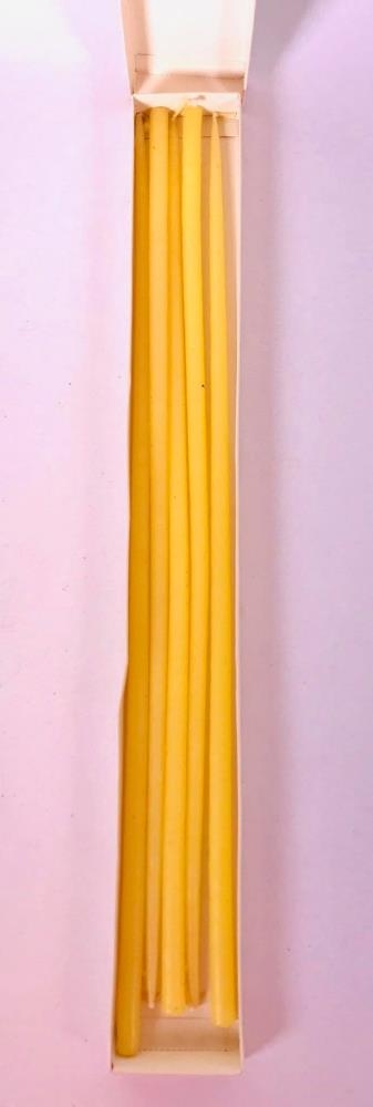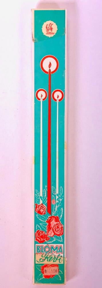 Aflangur kertapakki, kertin sjálf 40 cm há og 1 cm á breidd. Í pakkanum eru 5 kerti, gætu hafa verið um 10 stk. upprunalega. Kassinn er ljós en lokið er grænt, mynd af kertunum, rautt og hvítt, rauðar rósir. áletrun : Blómakerti. Kr. 1,50. Framleiðandi H.F. Hreinn (logo hreindýr)