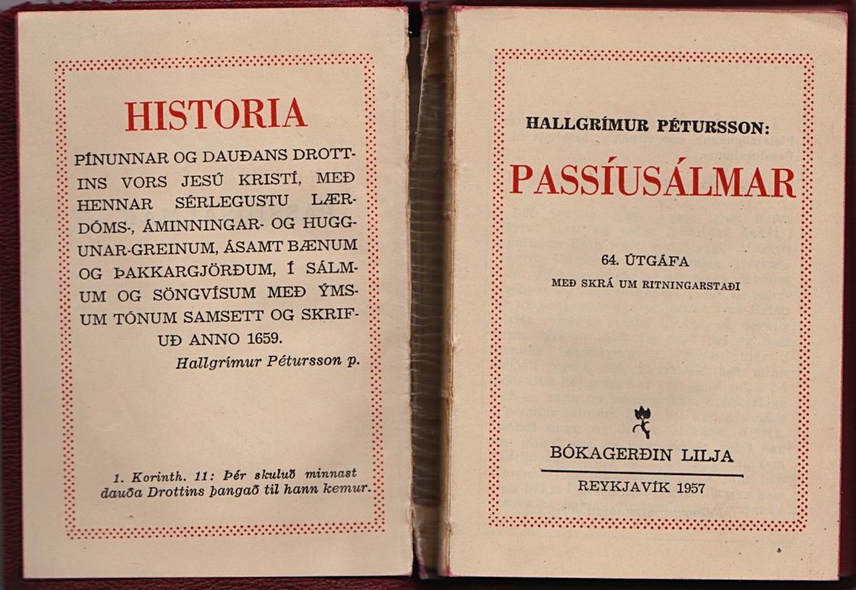 Passíusálmar Hallgríms Péturssonar (1614-1674). Útgefið Lilja árið 1957 í Reykjavík. Á titilblaði stendur að sé 64. útgáfa en rétt er að sé 63. prentun. 221 bls. Þarfnast lagfæringar. Rauð að lit.