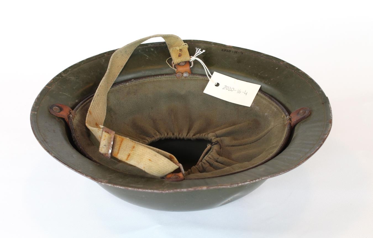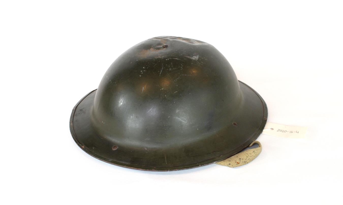 Loftvarnarhjálmur úr málmi, grænn að lit, með hökubandi úr taui. Loftvarnarnefnd flutti inn slíka hjálma og notaði á stríðsárunum.