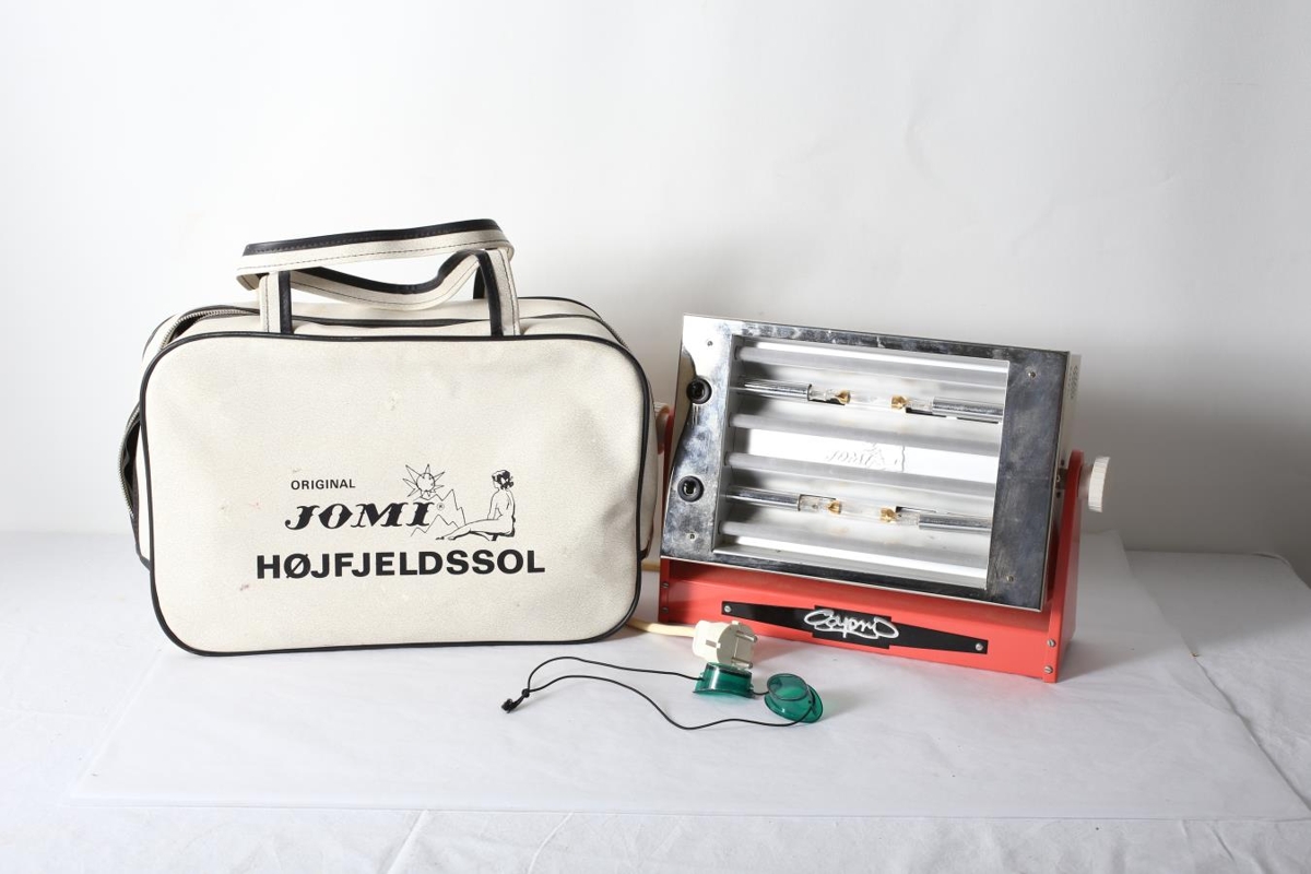 Háfjallasól, háfjallalampi til að nota í heimahúsi. Var vinsælt í kringum 1970, gott við margskonar verkjum. Lampinn kemur í hvítri tösku sem á stendur: Original Jomi Höjfjeldssol. Græn gleraugu fylgja með. Úr búi Birnu Björnsdóttur og Júlíusar G. Bjarnasonar sem bjuggu á Eiðum (Endurvarpsstöð).