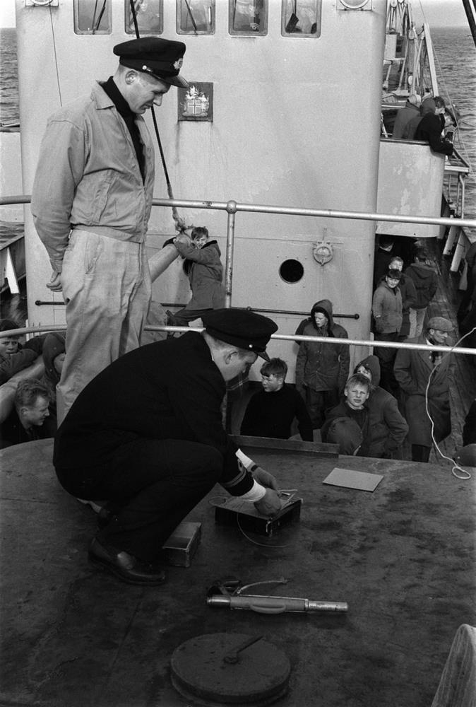 Landhelgisgæslan bauð piltum úr sjóvinnunámskeiði Æskulýðsráðs Reykjavíkur í sjóferð með varðskipinu Ægi þann 19. mars 1960. Fylgdarmenn með strákunum voru þeir Hörður Þorsteinsson, skipstjóri og Jón Pálsson, fulltrúi Æskulýðsráðs.
