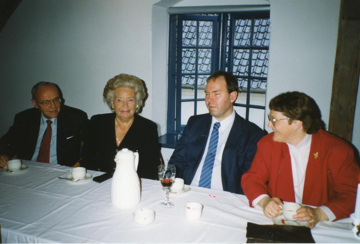 Stjórnarfundur ÖBÍ 1990. Arinbjörn Kolbeinsson, .., Arnþór Helgason, Elín Helga Árnadóttir. Sitja að snæðingi.
