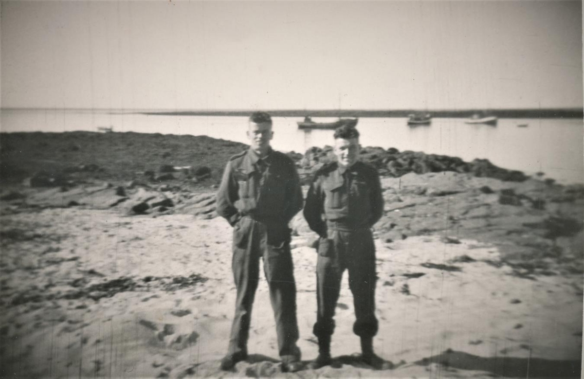 Mynd af óþekktum hermönnu, með kletta, sjó og báta í baksýn.