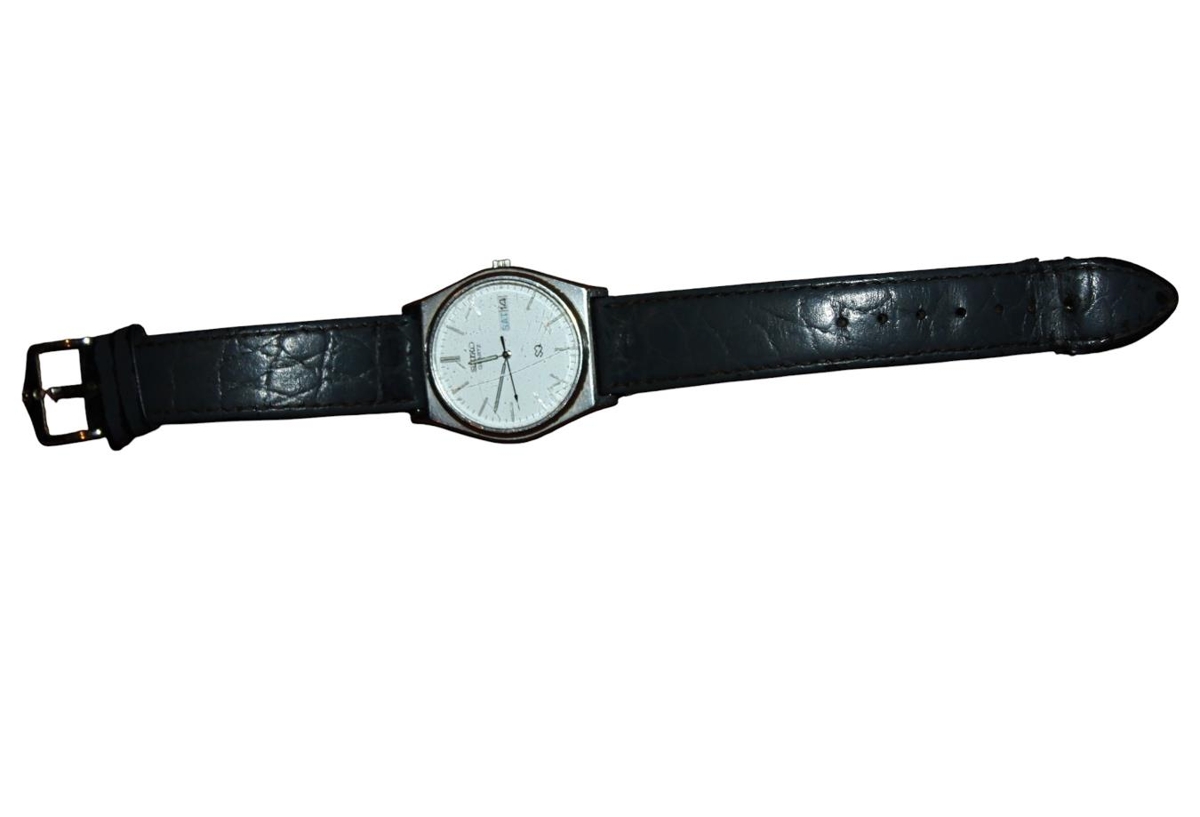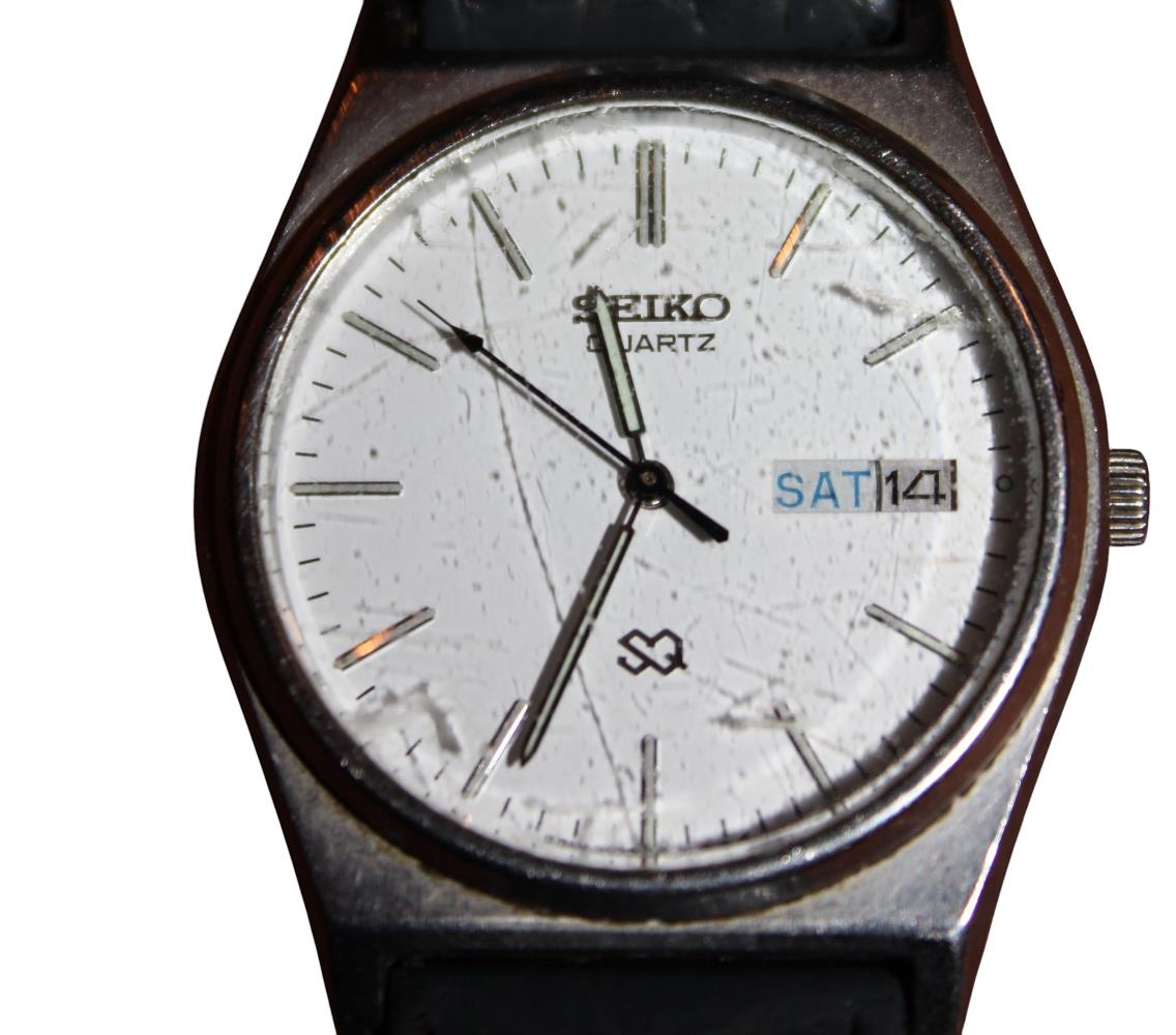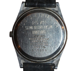 Armbandsúr af gerðinni Seiko Quarty 53, framleitt í Japan. Úrið er með svartri leðuról og á bakhlið er grafið "Jón J. Eiríksson - 25 ár - Sementsverksmiðja Ríkisins" Þvermál úrsins 3 sm.