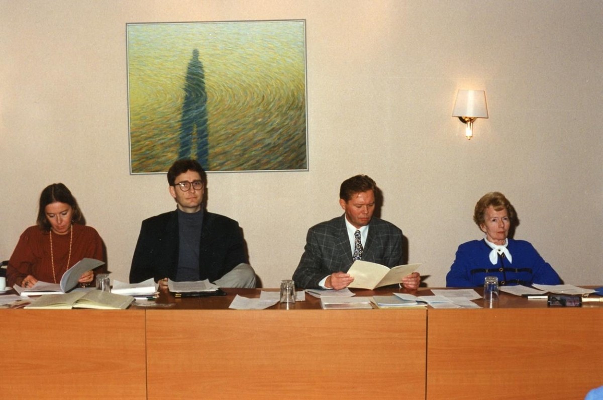 Aðalfundur ÖBÍ 1996. Þórey V. Ólafsdóttir, Helgi Hróðmarsson, Þórir Þorvarðarson, Ólöf Ríkarðsdóttir. Fjórar manneskjur sitja við borð. Í bakgrunni málverk og lampi á vegg. Leifar af lími eru aftan á ljósmyndinni.