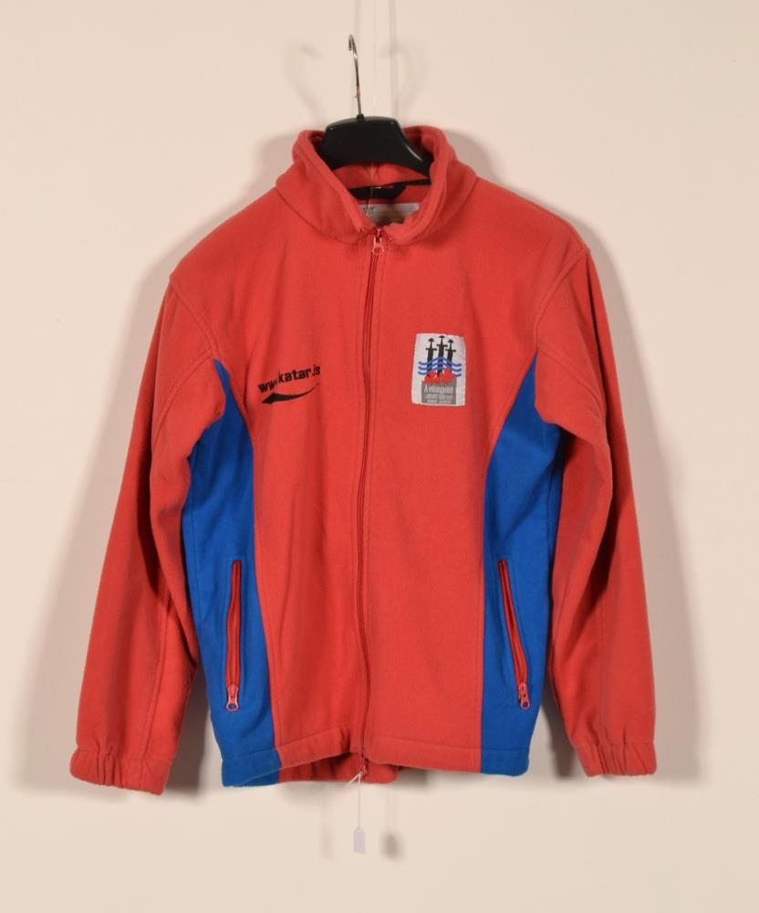 Bleik og blá flíspeysa í stærðinni S. Á peysuna er saumað merki landsmóts skáta 2008 á vinstra brjóst. Merkið samanstendur af þrem sverðum sem standa upp á endann og með bláa öldu framan við og liljan og smárinn í forgrunni. Á merkið er letrað „Á víkingaslóð. Landsmót skáta 2008. Hamrar - Akureyri“. Á hægra brjóst er saumað í peysuna vefslóð Bandalags Íslenskra Skáta „WWW.skatar.is“. Um nokkurra ára skeið var útbúin sérstök landsmóts flíspeysa af Bandalagi íslenskra skáta.