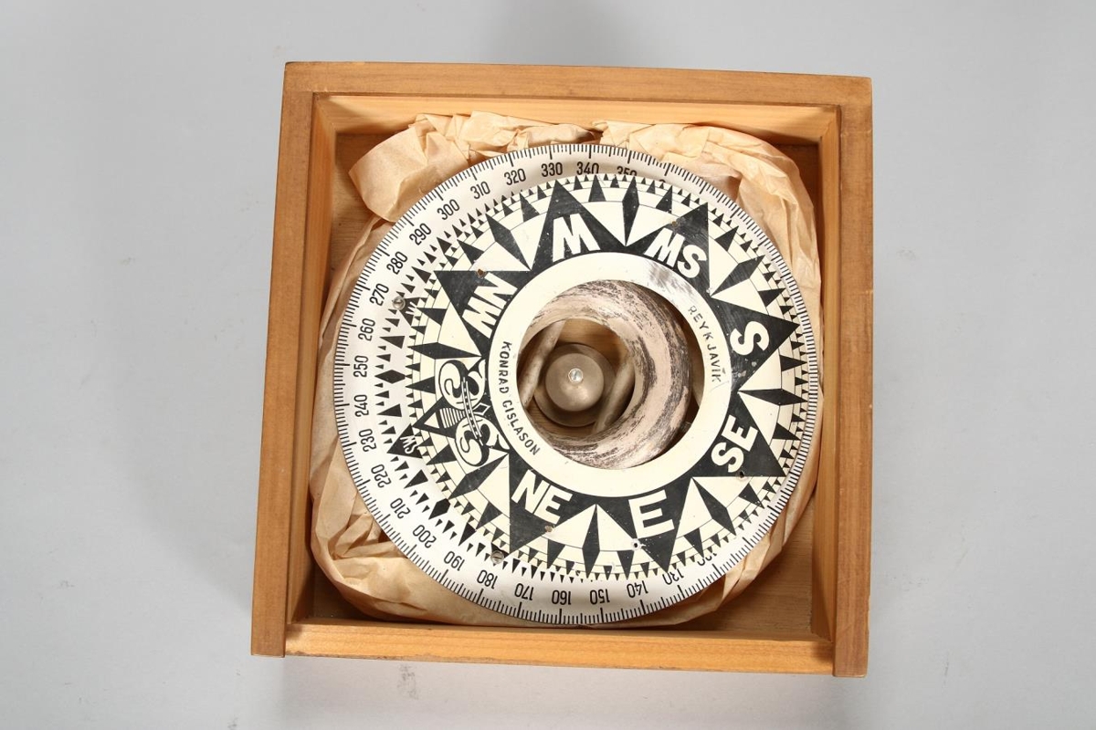 Kassi með tveimur misstórum skífum í áttavita (kompás). Úr fórum Jakobs Jakobssonar skrifstofustjóra á Neskaupstað, tengdaföður gefanda.