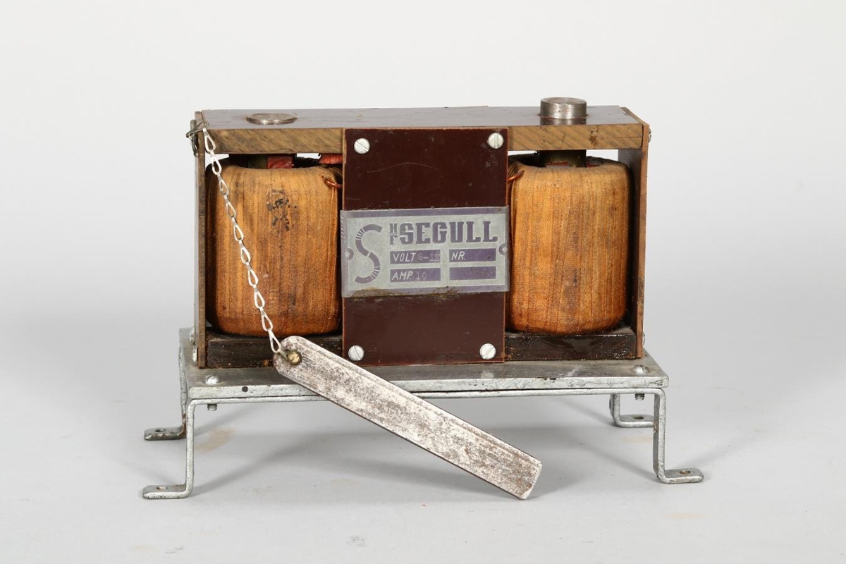 Segulmagnari úr málmi með segulspólum og tengingu við rafmagn, til að segulmagna skífur og fleira fyrir áttavita. Úr fórum Jakobs Jakobssonar, tengdaföðurs gefanda.