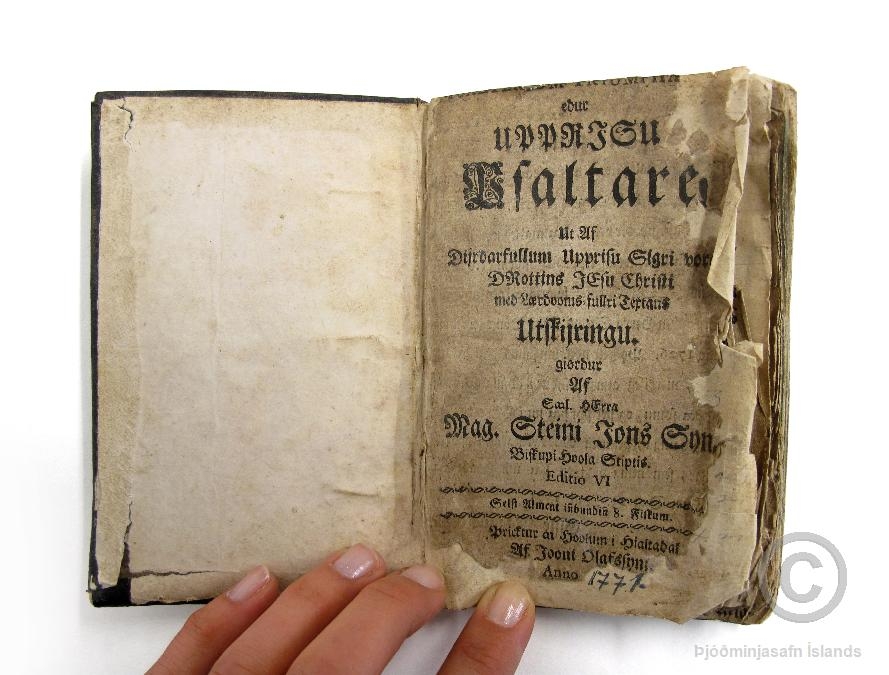 PSALTERIUM TRIUMPHALE [einungis sést neðsti hluti þessarar áletrunar] edur UPPRISU Psaltare Ut Af Dijrdarfullum Upprisu Sigri vors DRottins JEsu Christi með Lædooms fullri Taxtans Utskijringu. gjördur Af Saal. HErra Mag. Steini Jons Syne Biskupii Hoola Stiptis. Editio VI. Selst Alment innbundinn 8. Fiskum. Þrictur aa Hoolum í Hialtadal Af Jooni Olafssyni. Anno 1771.