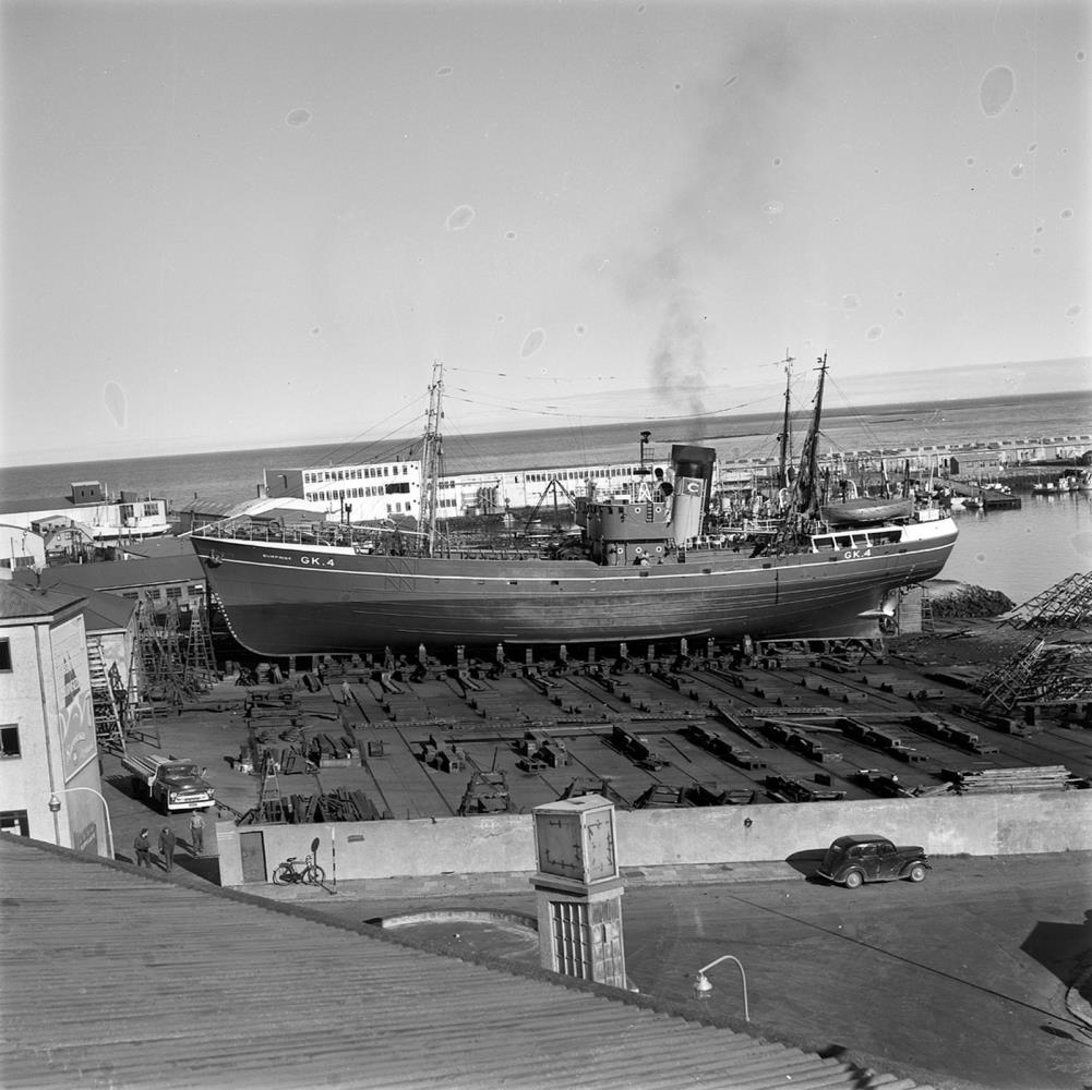 Síðutogarinn Surprise frá Hafnarfirði eftir að hafa verið botnhreinsaður og málaður í Slippnum við Mýrargötu. Ég tók eflaust þessar myndir fyrir föður minn sem var skrifstofustjóri Slippfélagsins í Reykjavík hf í tæp 40 ár.