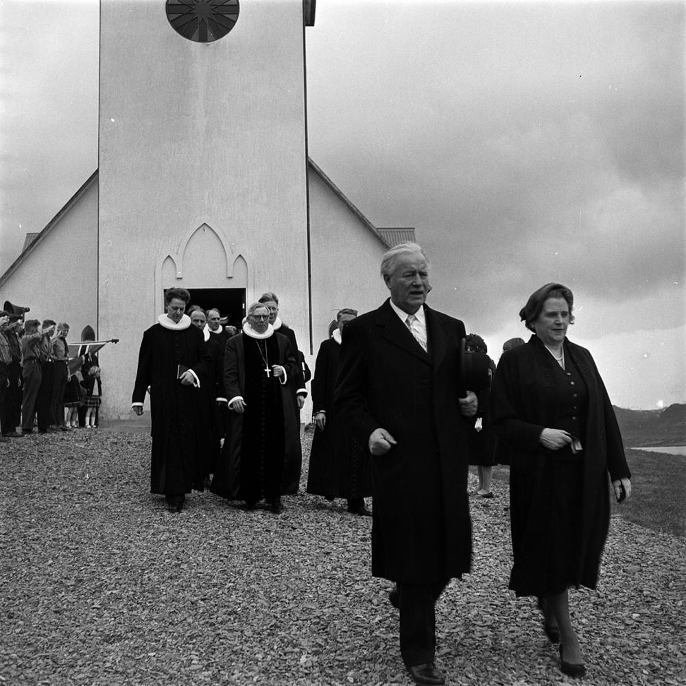 Borgarneskirkja. Frá vígsluathöfninni. Forseti íslands, Ásgeir Ásgeirsson og kona hans Dóra Þórhallsdóttir koma úr kirkjunni og á eftir þeim koma prestarnir. Skátar standa heiðursvörð.
