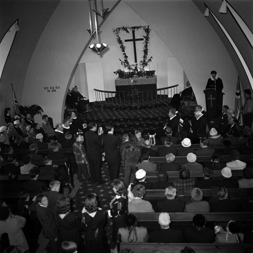 Borgarneskirkja. Frá vígsluathöfninni. Prestur er í predikunarstól og talar til safnaðarins. Forsetahjónin sitja við altarið.