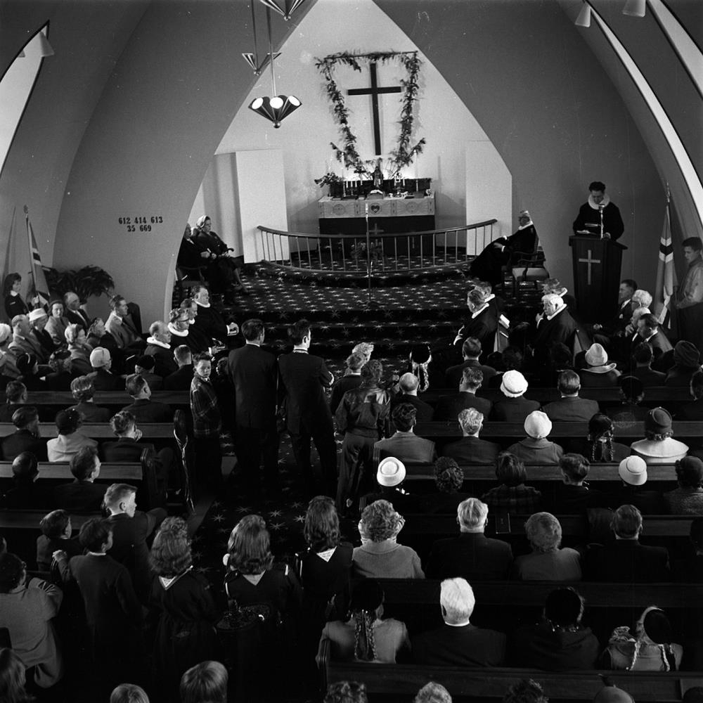 Borgarneskirkja. Frá vígsluathöfninni. Prestur er í predikunarstól og flytur guðsorð.