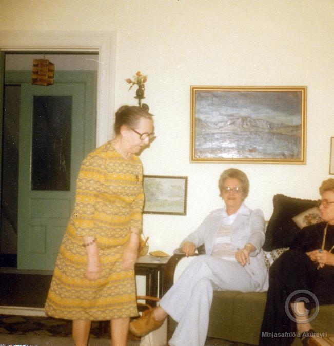Heimsókn til Helgu Ólafsdóttur. Helga stendur á myndinni, óþekktar konur sitja í sófa.