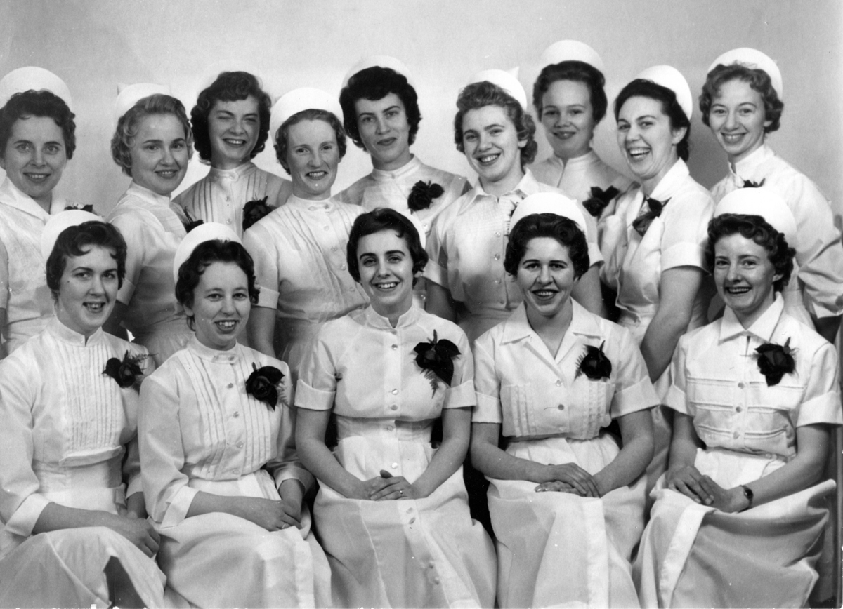 Útskriftarhópur frá Hjúkrunarkvennaskóla Íslands vor 1958 15 luku námi 14 eru á mynd ein á mynd 1957 H Sv Jónsdóttir.