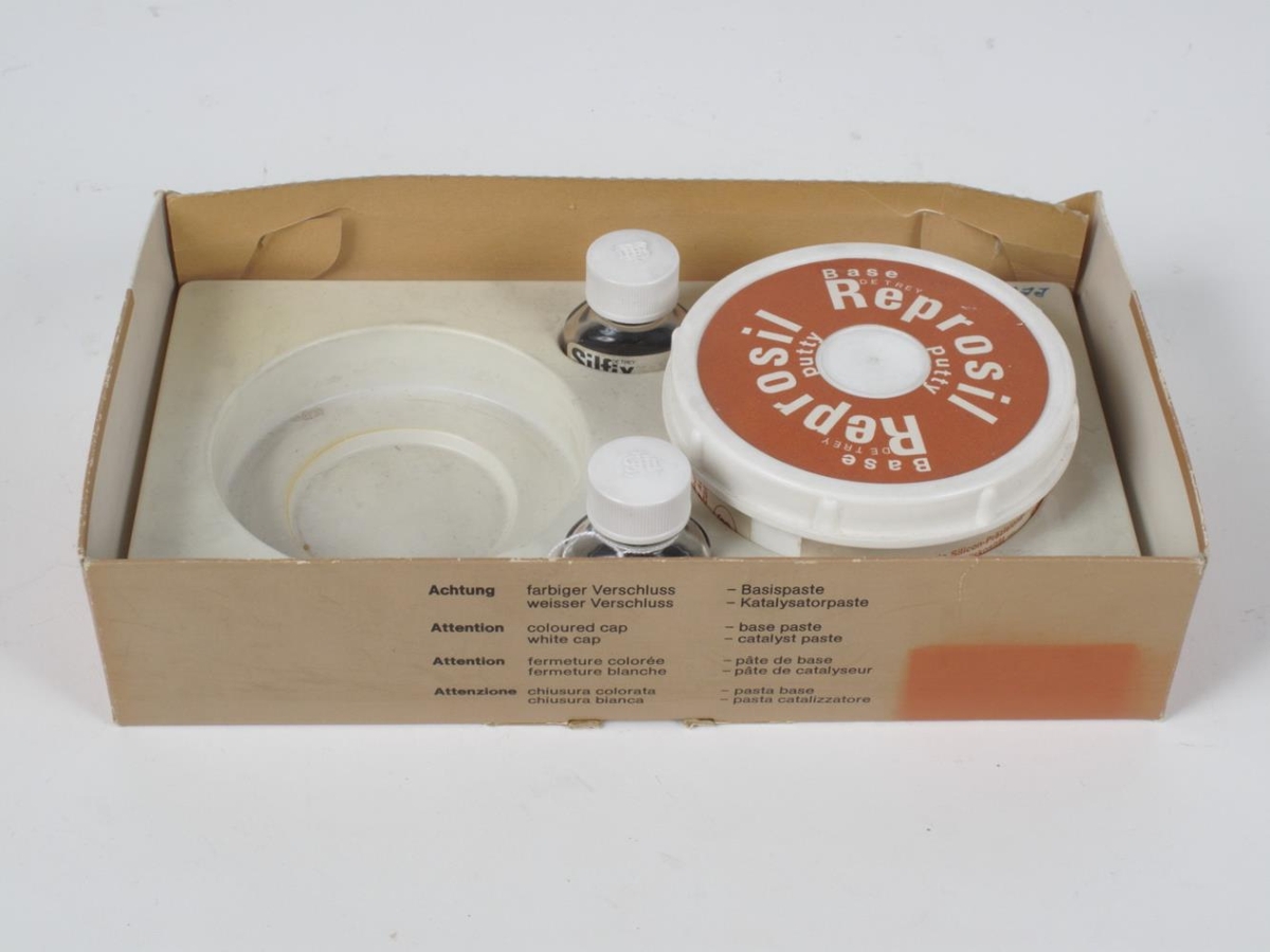 Reposil mótunarefni. Kassi inniheldur silikonkítti tvö glös af lími fyrir silikon.
