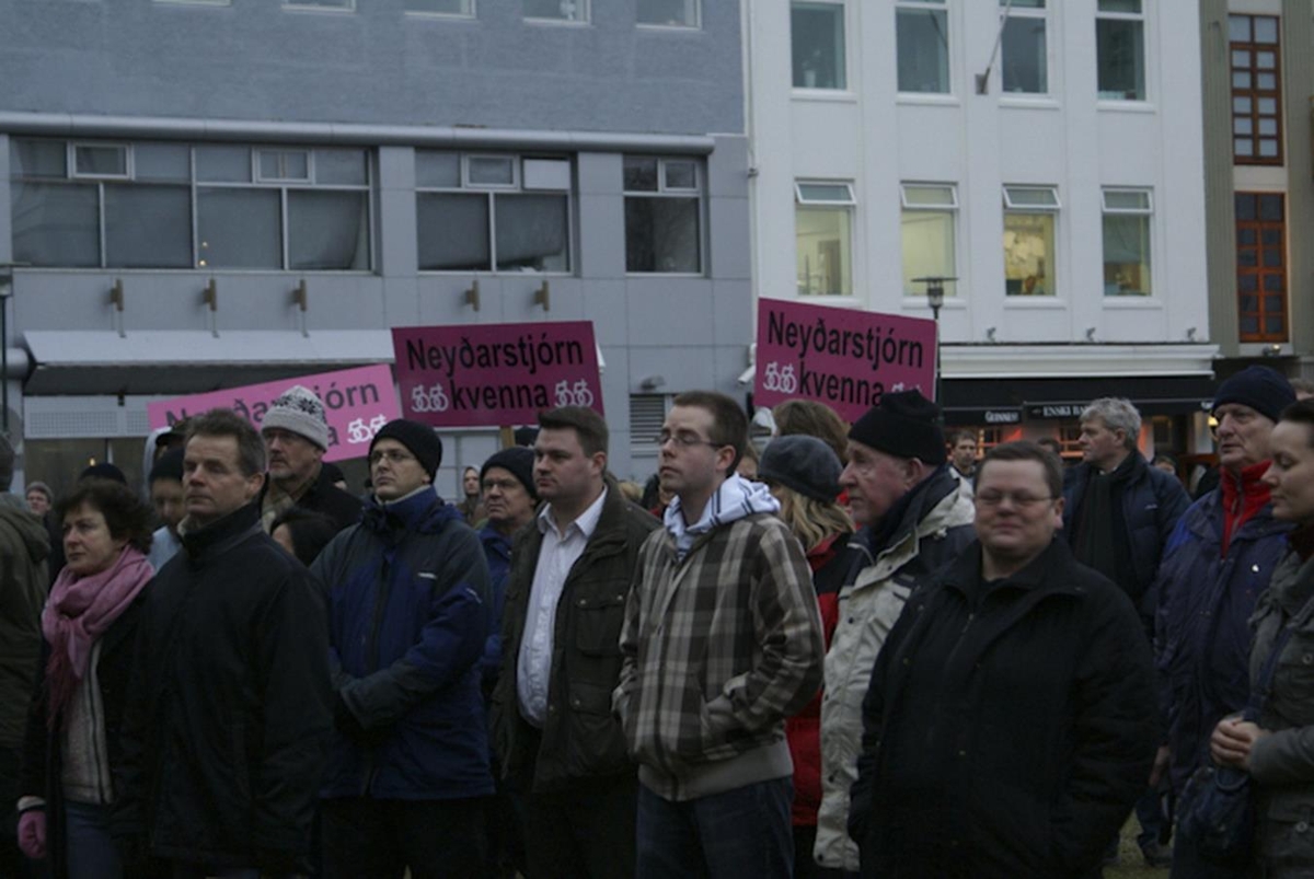Hópur mótmælenda fylgist með ræðuflutningi. Skilti með áletruninni Neyðarstjórn kvenna í bakgrunni.