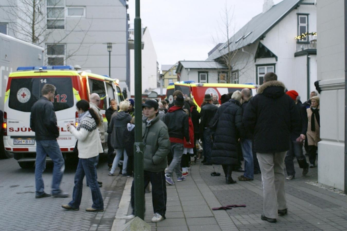 Tveir sjúkarbílar við húshorn. Mannfjöldi að fylgjast með.