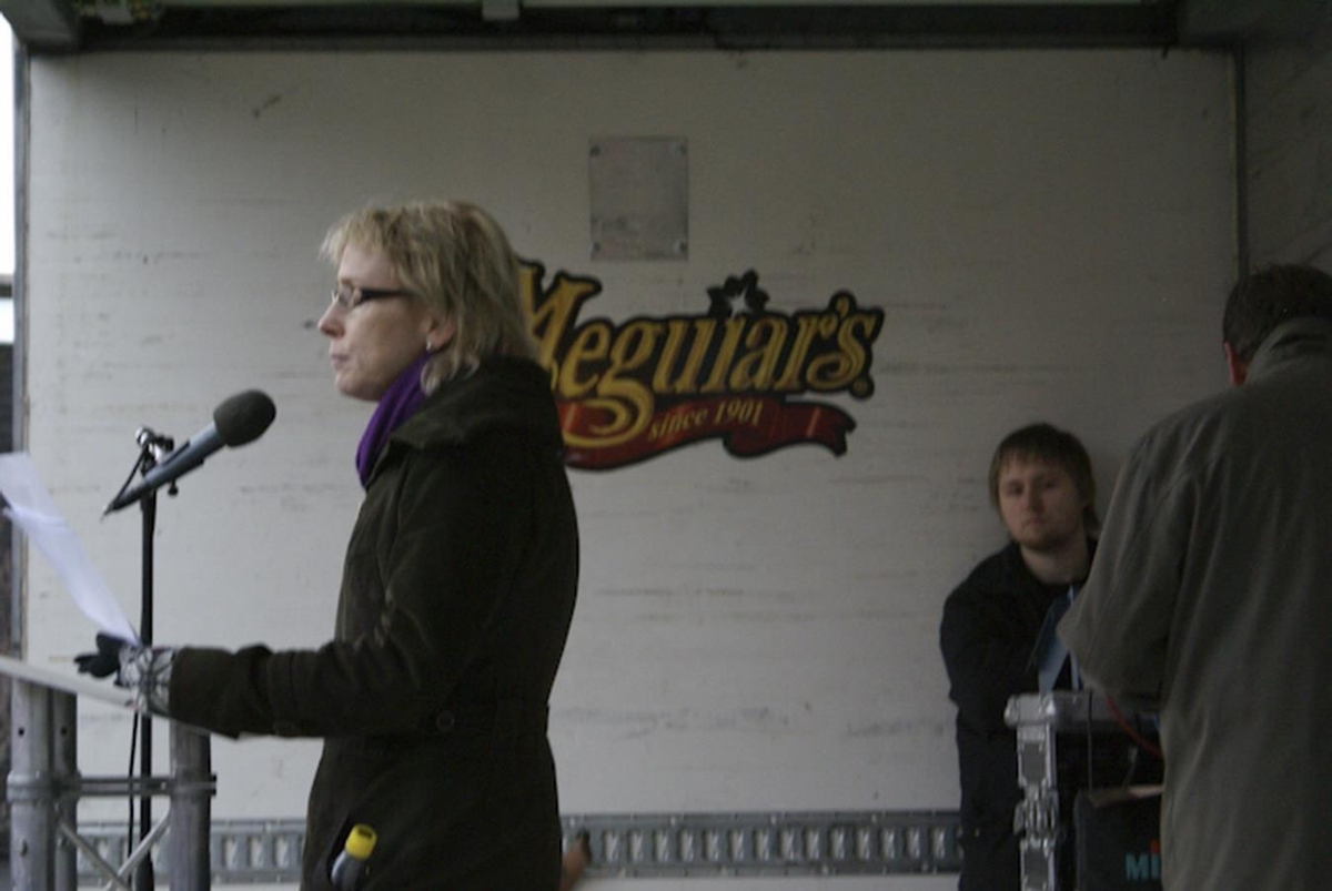 Kona að halda ræðu af palli flutningabíls. Tveir menn við hljómtæki í bakgrunni.
