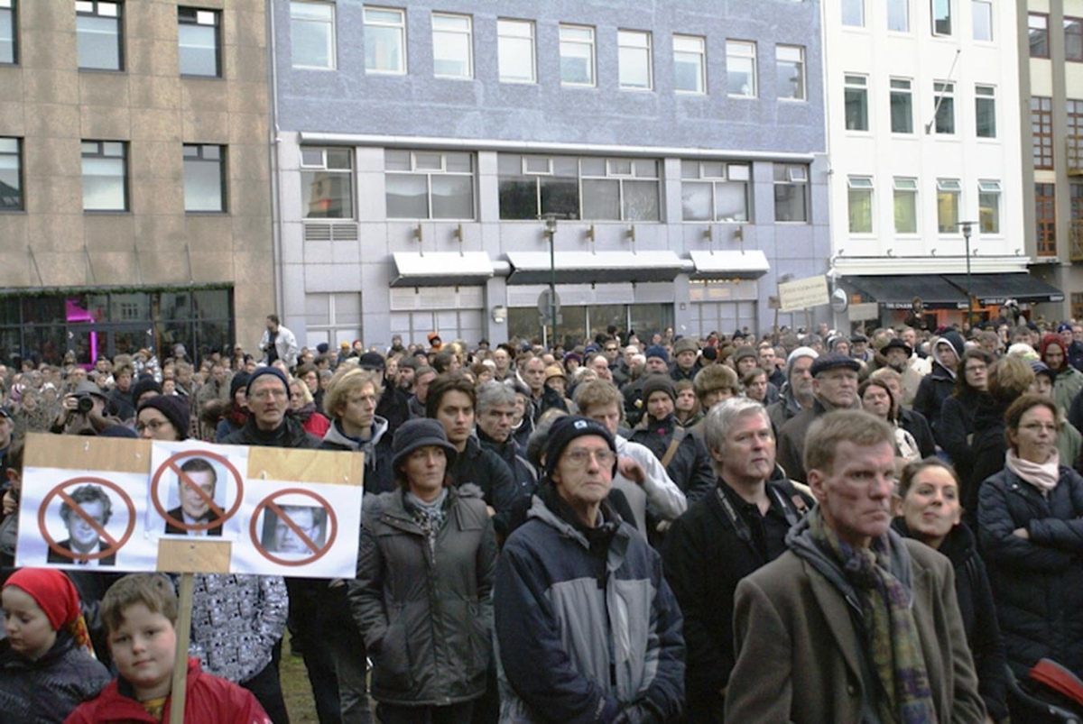 Hluti af mótmælendum á fundi á opnu torgi. Krakki með kröfuspjald með myndum þriggja manna af Davíð Oddssyni, Geir Haarde og Árna Matthisen umluktum rauðum hringjum og yfirstrikunum.