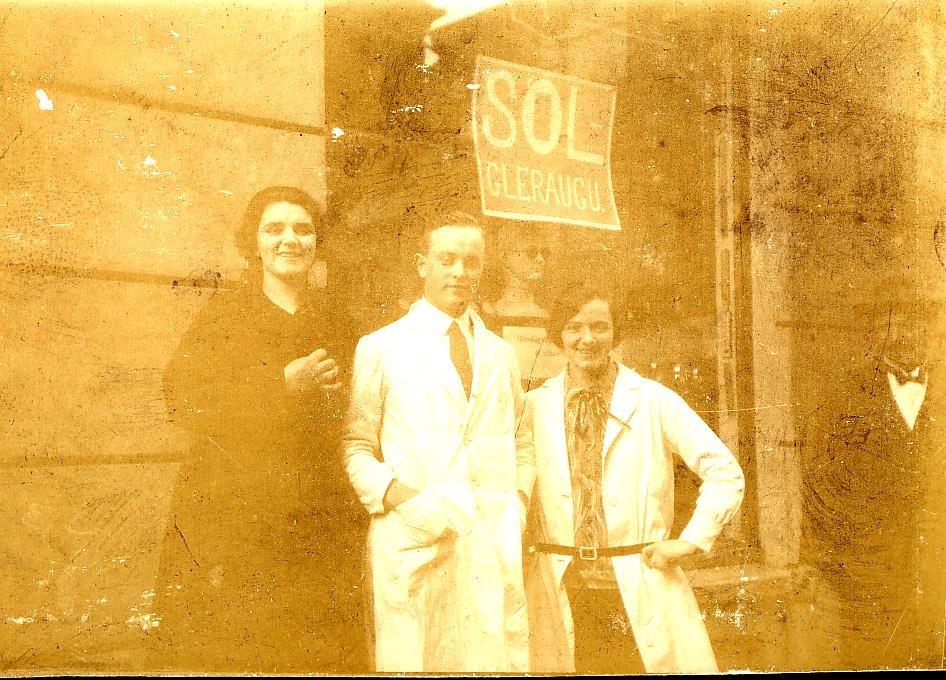Mynd úr búi Arons Guðbrandssonar og Ásrúnar Einarsdóttur. Myndin er tekin fyrir framan búðarglugga apóteks. Frá vinstri: Óþekkt kona í úlpu, Guðni Ólafsson apótekari í vinnufötum, óþekkt afgreiðslukona, Kai Carlo Petersen apótekari. Í glugga auglýsingaspjald fyrir sólgleraugu.