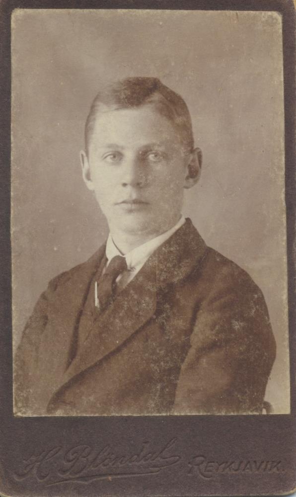 Maður situr fyrir mynd. Mynd merkt á bakhlið 'Til hamingju Kormi' og dagsett 28-10-21. Frá Vilborgu Sæmundsdóttur, upprunalega úr búi Guðmundar Jónssonar oddvita og Brynjólfs Árnasonar skósmiðs.