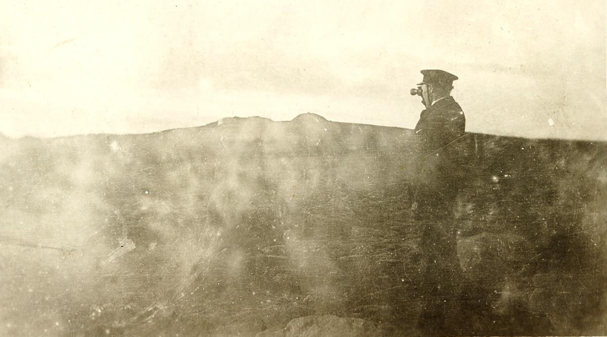 Mynd úr búi Arons Guðbrandssonar og Ásrúnar Einarsdóttur. Maður horfir í sjónauka á fjöll. Óskýr mynd. Ferdinand Róbert Eiríksson,13. ágúst 1891 - 12. feb. 1978, skósmíðameistari í Reykjavík. Bjó á Grettisgötu 19. Giftur Magneu Ólafsdóttur, þau áttu saman sex drengi og eina stúlku, Vigdísi.