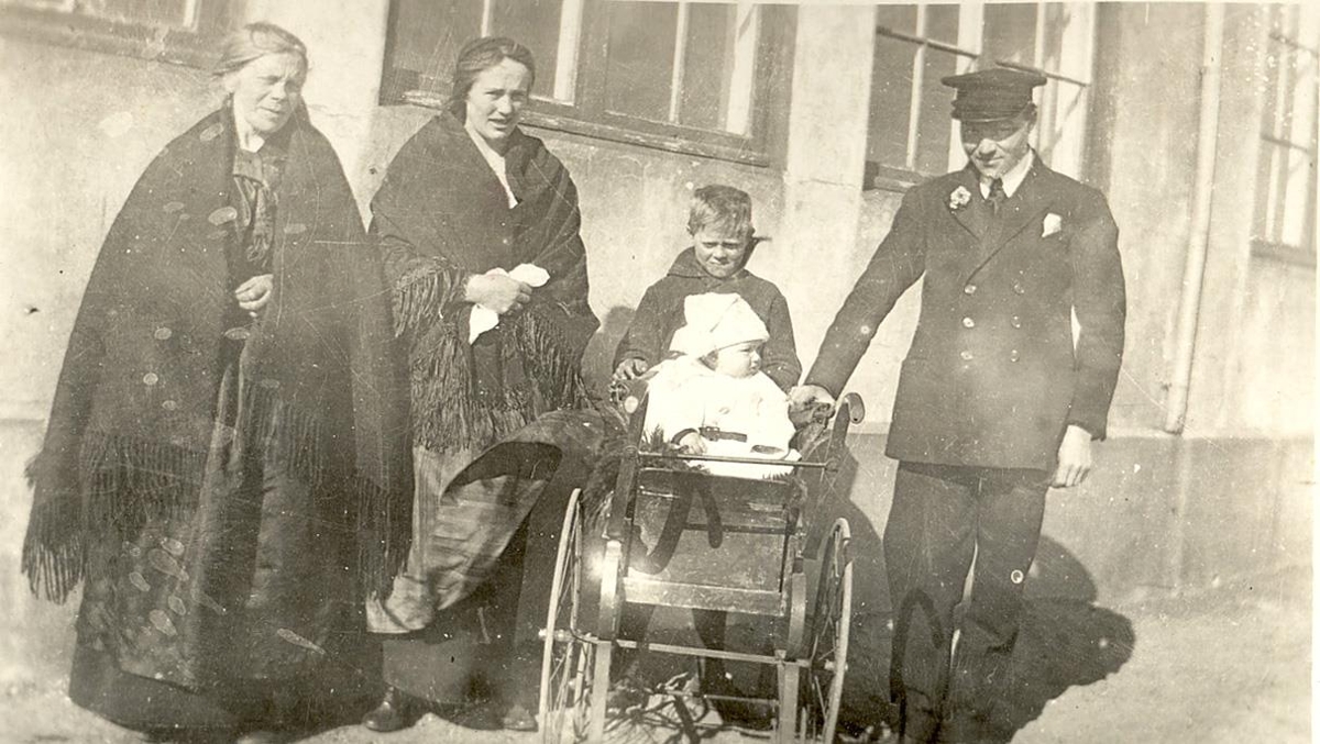 Mynd úr búi Arons Guðbrandssonar og Ásrúnar Einarsdóttur. Fólk fyrir framan hús. Frá vinstri Guðrún Gísladóttir (1867-1958), Magnea Ólafsdóttir dóttir Guðrúnar, Sigurjón Ólafsson síðar myndhöggvari, Vigdís Ferdinandsdóttir í barnavagni og Ferdinand Eiríksson skósmiður og maður Magneu.