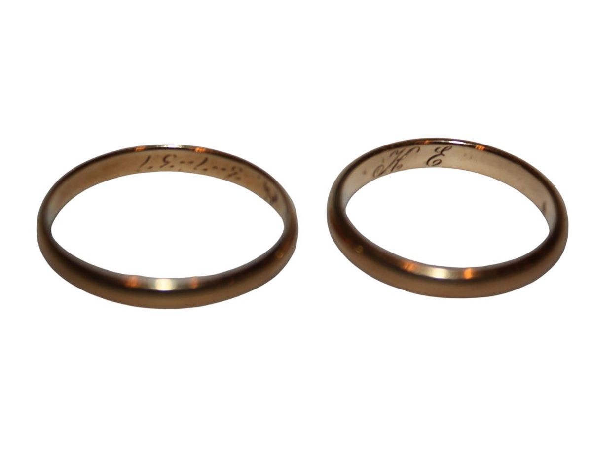 Tveir giftingahingar úr glulli (14 k) og er merkt 3-7-37 K.E.