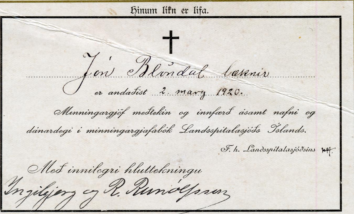 Gjöf frá Ingibjörgu og R. Runólfssyni til Landsspítalasjóðsins í minningu Jóns Pálssonar Blöndal, héraðslæknis að Stafholtsey. Hann lést stuttu eftir fyrri konu sinni, Sigríði Björnsdóttur Blöndal, er hann drukknaði í Hvítá vorið 1920. Vigdís Gísladóttir Blöndal (frá Stafholti),seinni kona hans þá í minna en ár, tók við uppeldinu á sonum hans fimm.