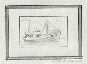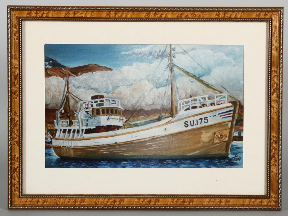 Innrömmuð ljósmynd af vatnslitamynd sem Einar Helgason frá Eskifirði gerði af Víði SU-175. Gefandi er ekkja Sigurðar Magnússonar sem var skipstjóri og eigandi Vísi.