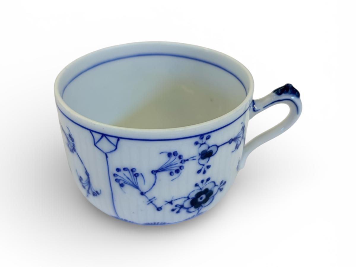 Bolli úr postulíni, hvítur með bláu munstri. Úr stelli, 8 bollar og 8 undirskálar auk fylgihluta.
