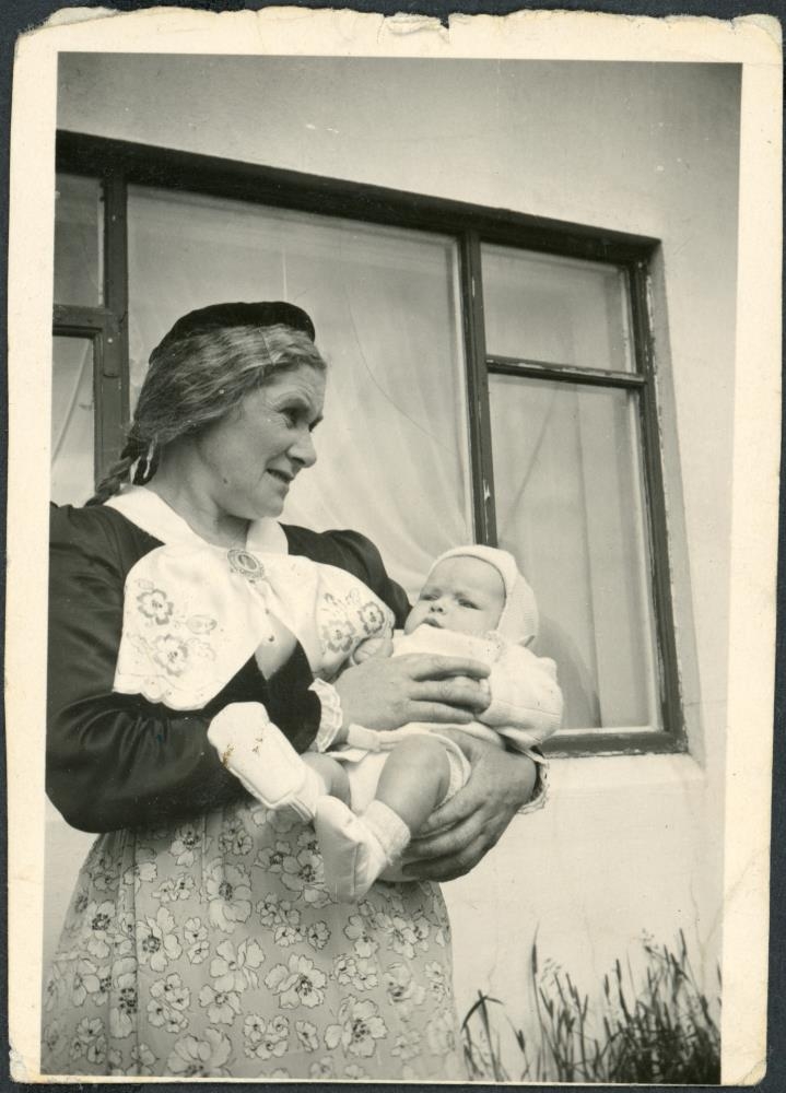 Guðrún Sigurbjörnsdóttir ljósmóðir á Hrappsstöðum ásamt sonarsyni sínum Sigtryggi Jónssyni.