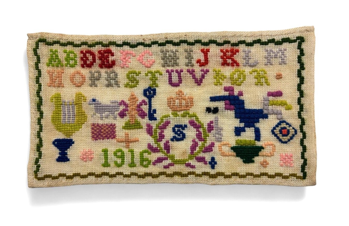 Stafaklútur. Grunnur drapplitur. Bókstafir, dýr og skraut er saumað í með krosssaumi með mislitu ullargarni. Ártalið 1916 er saumað í klútinn.