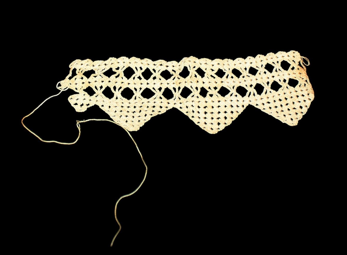 Verksmiðjuframleidd blúnda, sem hefur verið klippt af flík og hefur átt að geyma til seinni nota.