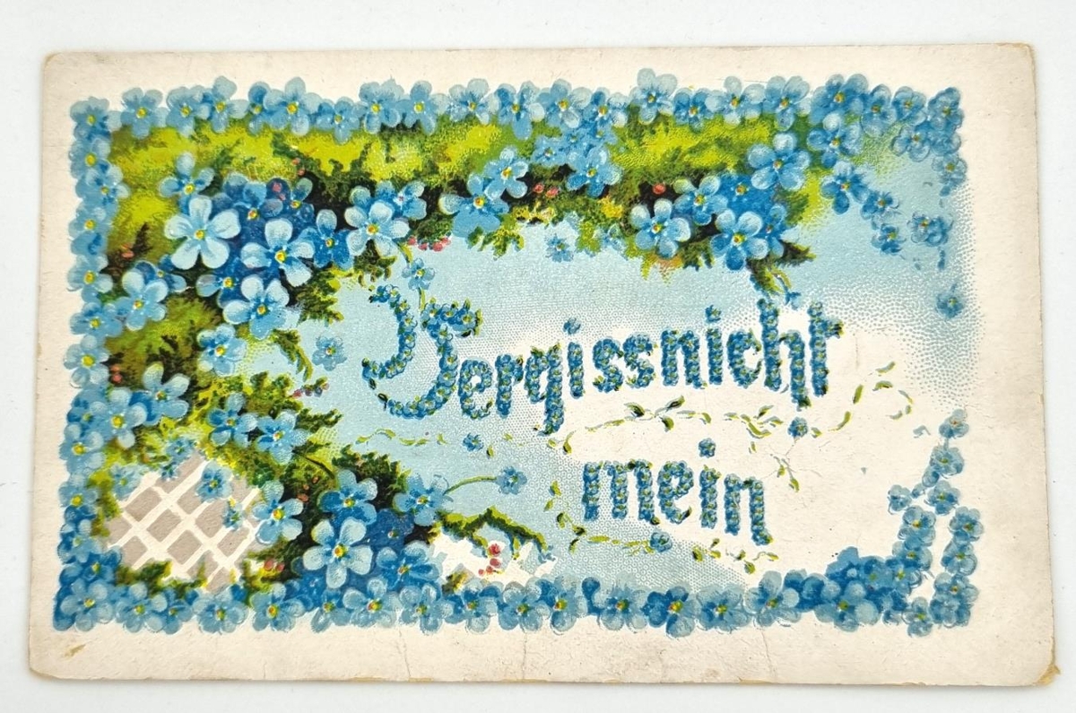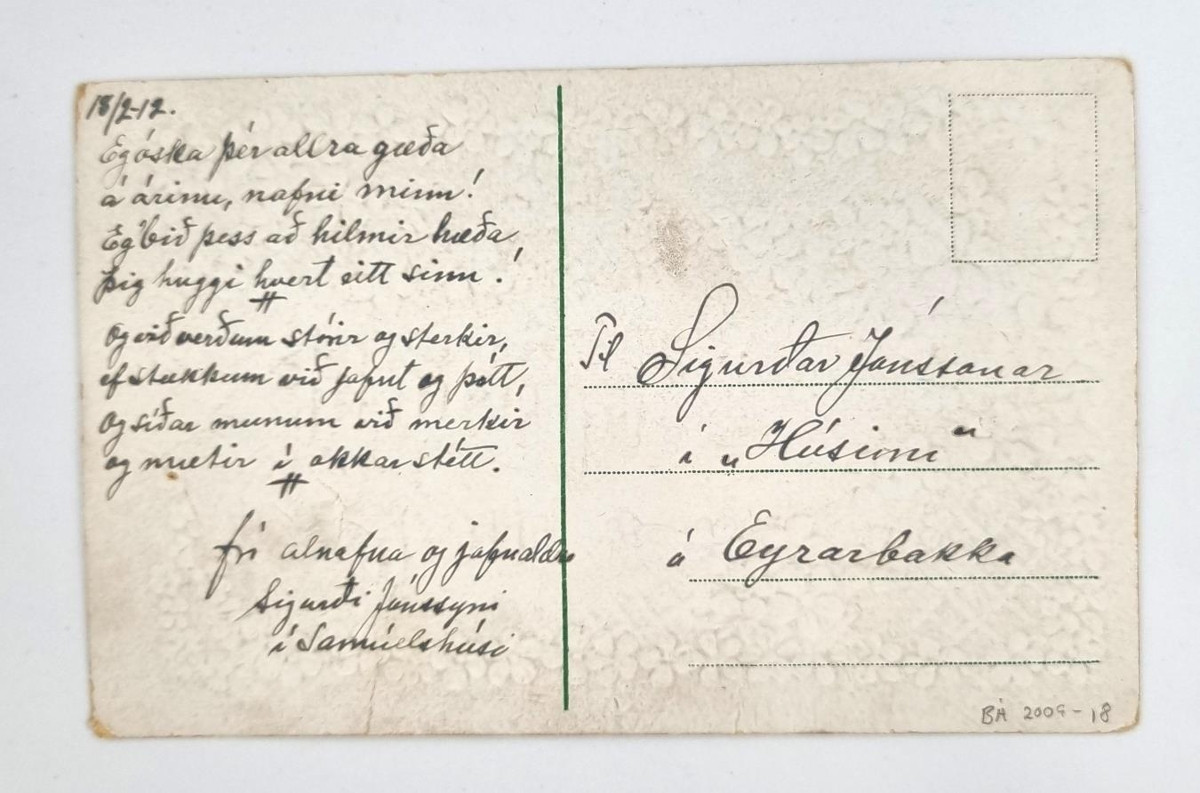 Afmæliskort frá árinu 1912 til Sigurðar Jónssonar sem þá bjó í Húsinu á Eyrarbakka. Kortið er frá alnafna hans og jafnaldra Sigurði Jónssyni í Samúelshúsi - einhver fullorðinn hefur skrifað kveðjuna. Á kortinu er blá blómabreiða og þýska áletrunin Vergissnicht mein.