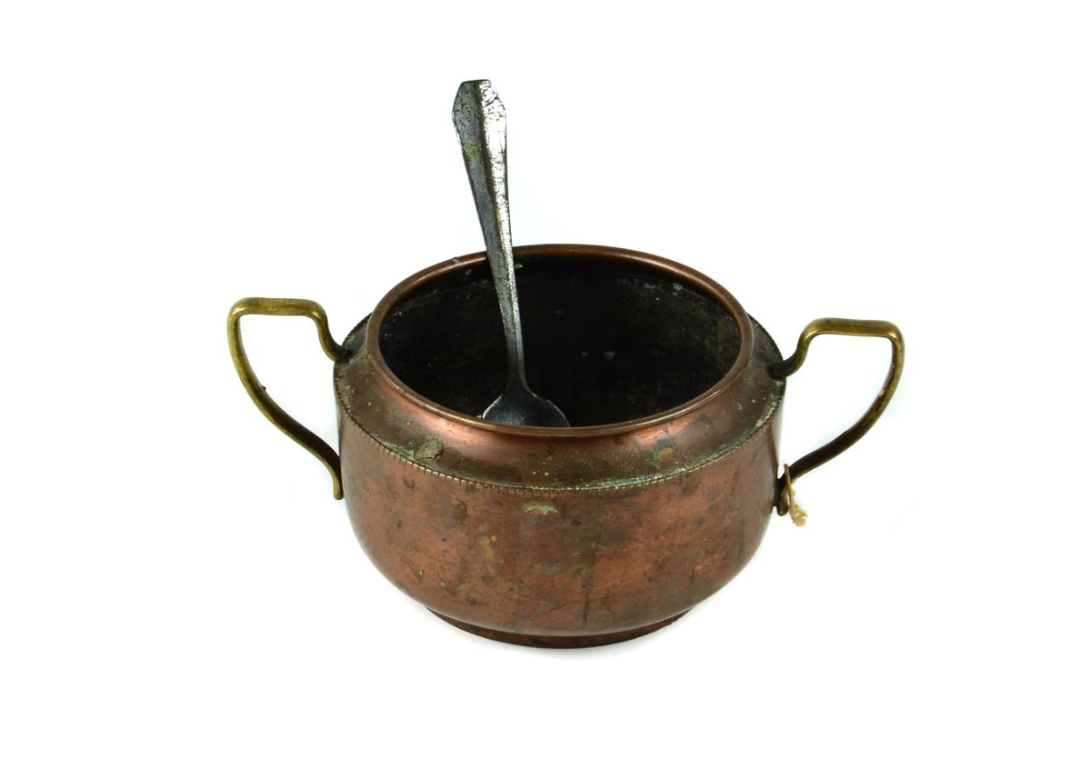 Sykurkar úr kopar. Sykurkarið er hringlaga með tveimur handföngum. Úr fórum Ole Tynes, síldarsaltanda og konu hans Indíönu Tynes. Frá fyrstu söfnun Síldarminjasafnsins, um 1977.