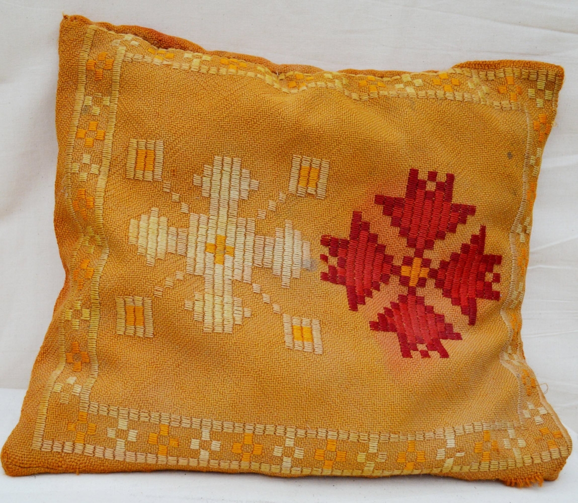 Útsaumaður púði (gobelinsaumur), grunnlitur brúnn, í útsaumi rautt og fleiri litir. Útsaumur á báðum hliðum. Verk Önnu Árnadóttur frá Akurey, konu Bergs sútara Einarssonar.