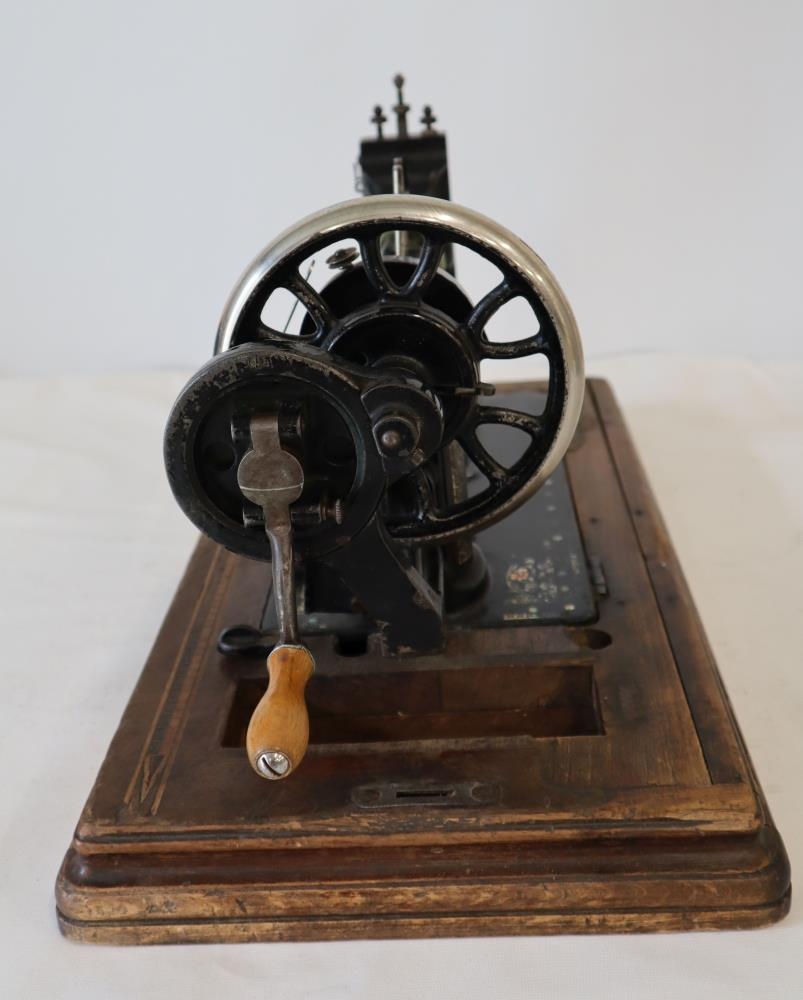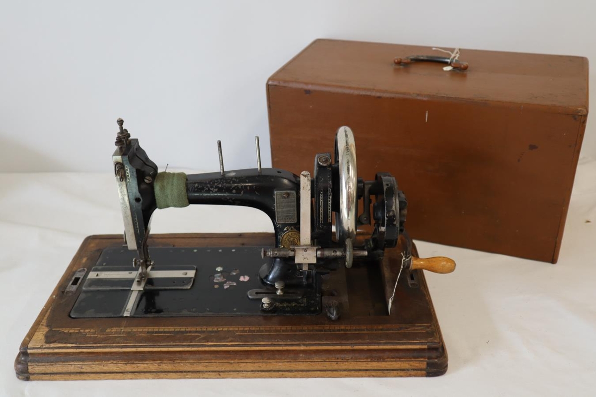 Dönsk saumavél í viðarkassa. Kassinn brúnmálaður með handfangi. Vélin er svört, með gylltu skrauti á tréplötu. Áletrun: Bergmann & Hüttemeier, Köbenhavn. Stærð plötu: 29 x 52 sm.