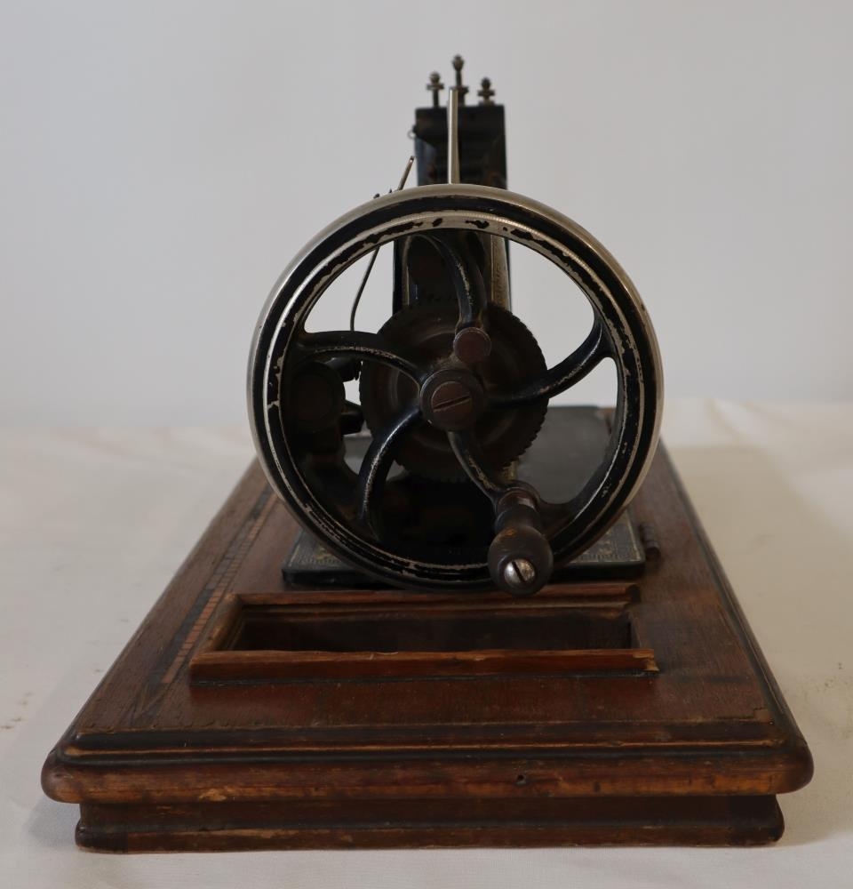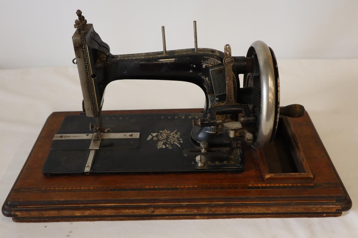 Svört handsnúin saumavél með gylltu skrauti. Á tréplötu.Vantar lokið. Áletrun Bergmann og Hüttemeier, Köbenhavn. Stærð plötu: 27 x 51 sm.
