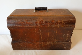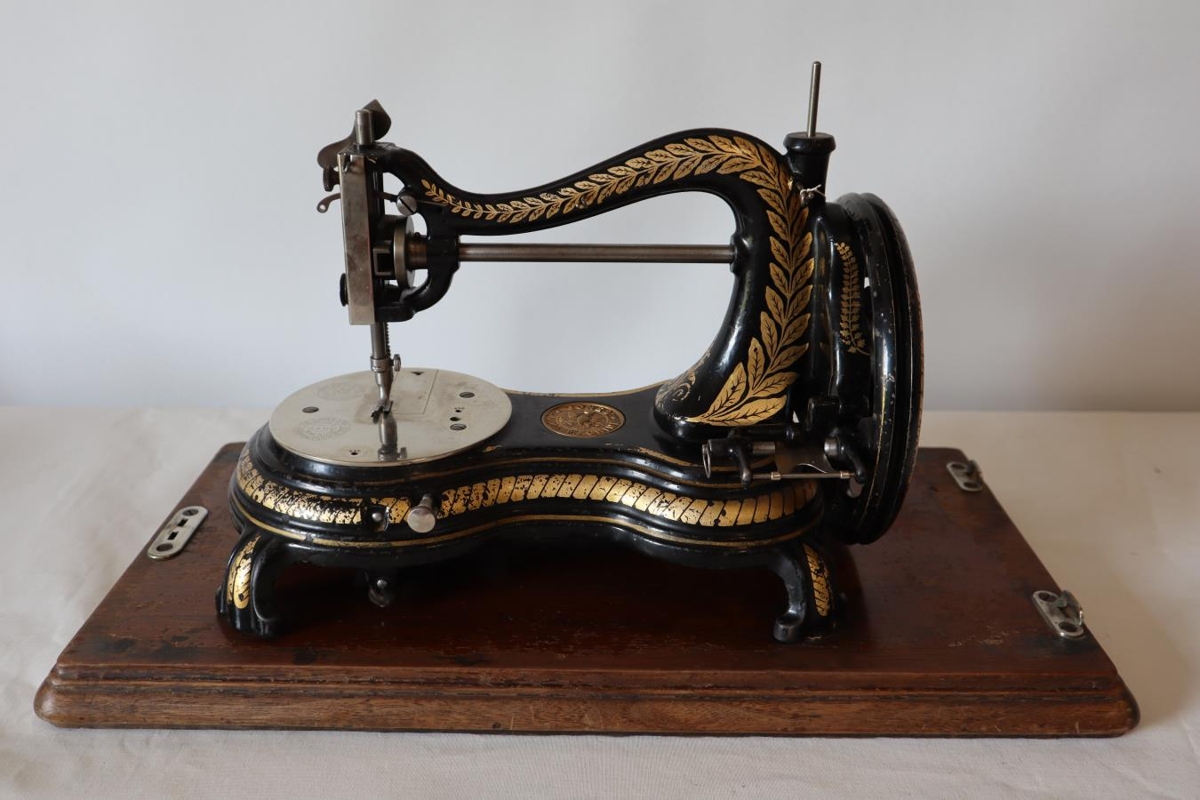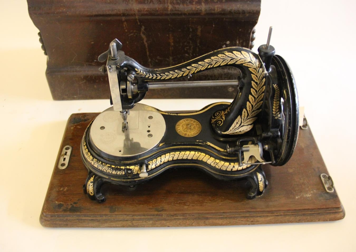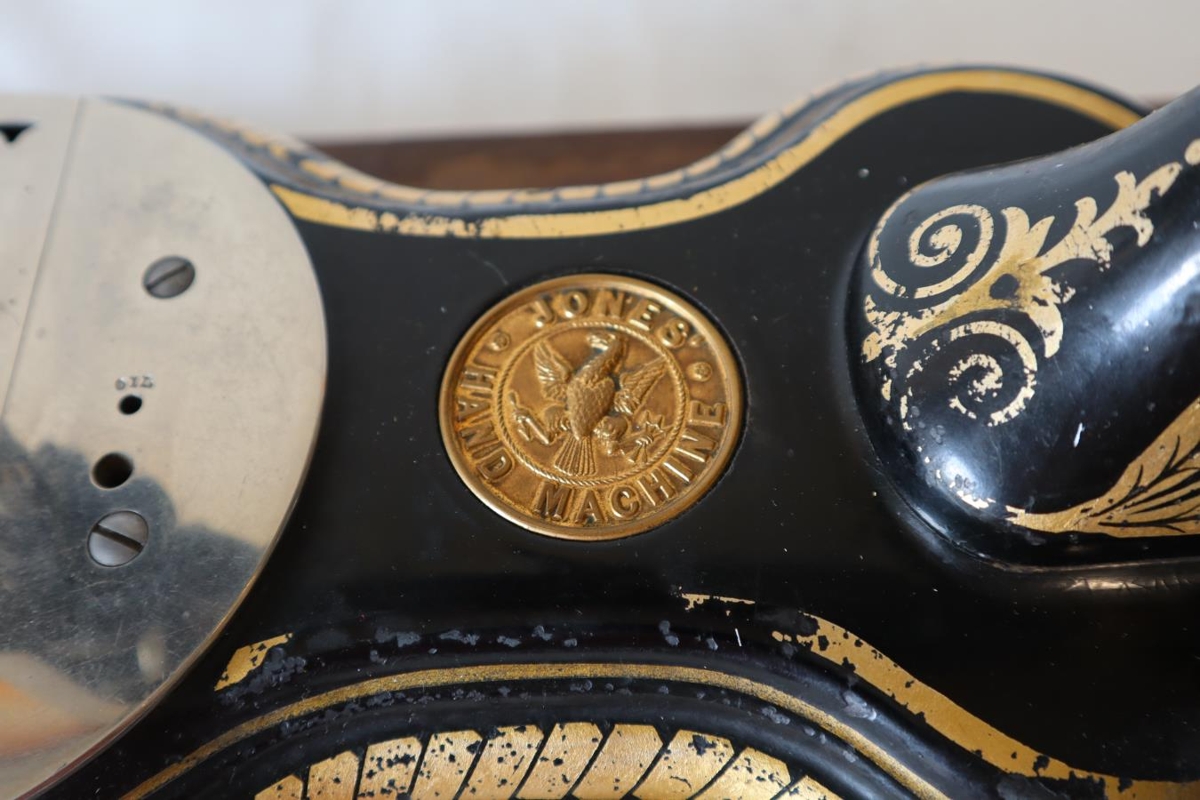 Saumavél á tréstétt, ensk að gerð, Jones Hand Machine, kölluð "Cat Back", "Serpentine" eða "Swan neck".