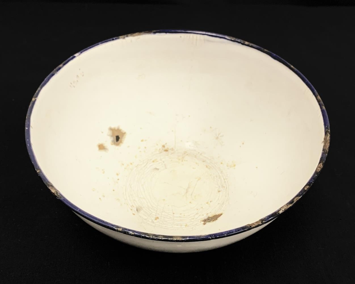 emaleruð með bláum börmum. Þvermál 18,5 sm hæð 7,5 sm.
