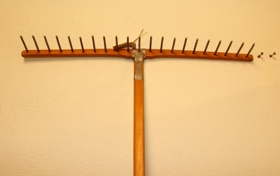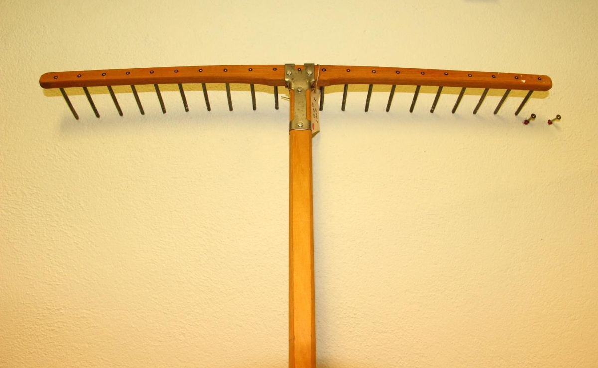 Skaft hrífunnar er úr furu. Hausinn úr eik og tindarnir úr áli. Amboðið (hrífan) er ónotað.