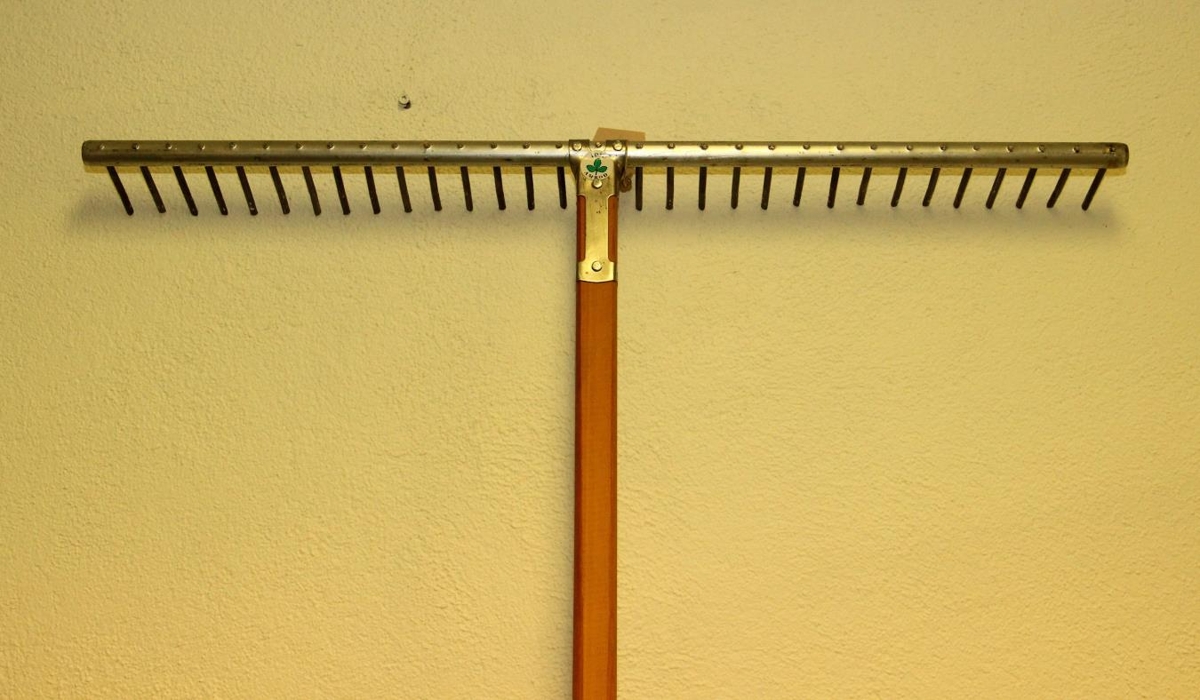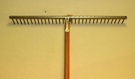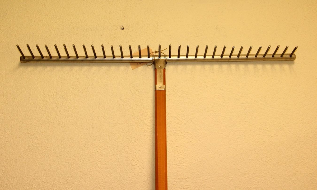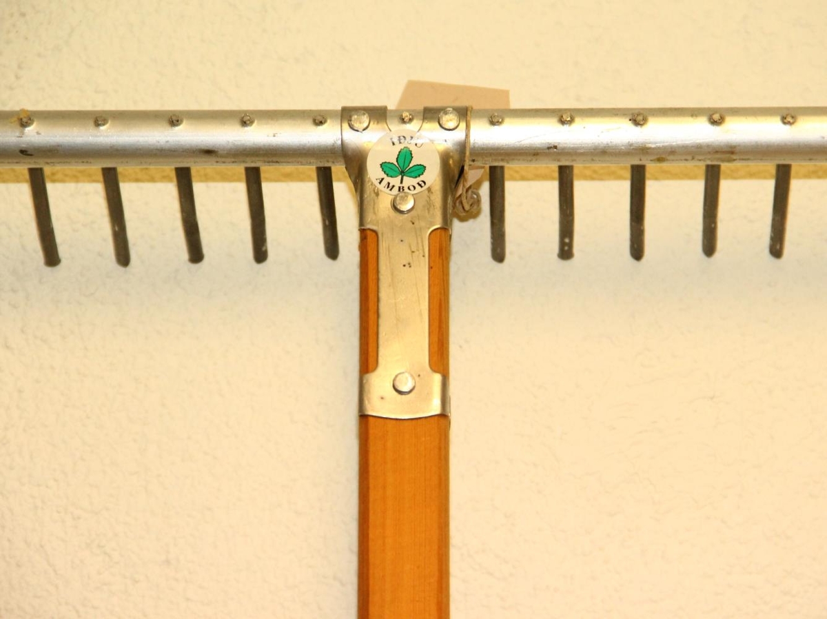 Skaft hrífunnar er úr furu. Hausinn og tindarnir (22 talsins) eru úr áli.. Amboðið (hrífan) er ónotað.