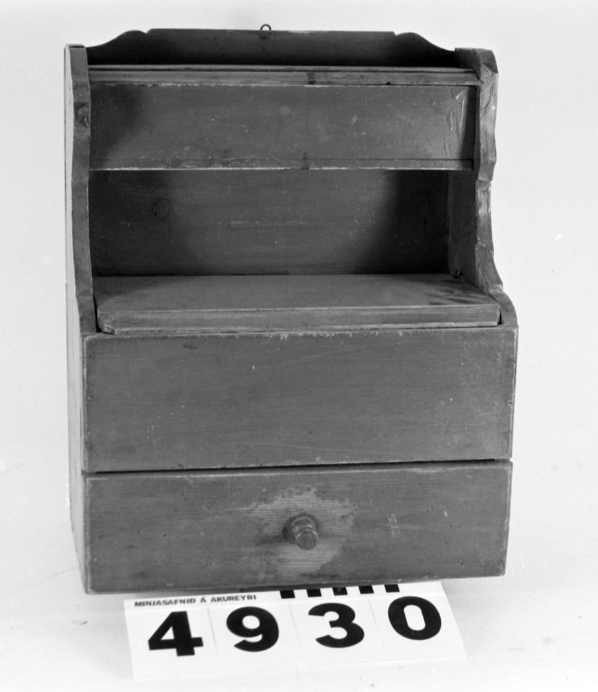 neðst. Á skúffunni er rendur trétappi sem handgrip.